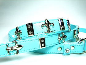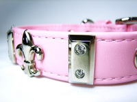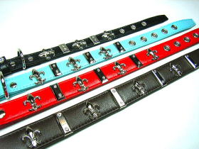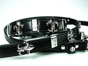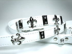 首輪の本体は牛革製で全てヘリを返した高級仕上げです。 高級感のある長方形の5面カットの金具にヨーロッパ製のクリスタルガラスを2個使用した、OKAMOTO-BELTオリジナルデザインの金具とユリの飾り金具を使用したクールな首輪です。 サイズオーダーも可能です。 |