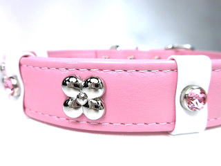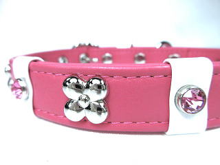 | 首輪の本体及び別色の巻き革は、牛革製で全てヘリを返した高級仕上げです。 メタリックフラワーの飾り金具と別色の巻き革の上にヨーロッパ製の高品質な7mmのクリスタルガラスを使用した高級感のあるキュートな首輪です。 表示以外の配色も可能です。 小型犬~大型犬に対応しております。サイズオーダーも可能です。 |